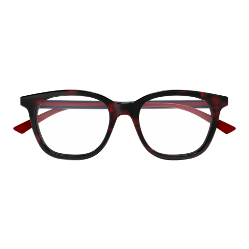 Commercial shape with the web detail on a slimmer temple. Squared cat-eye shape. Gucci interlocking logo on web temple. Commercial yet cool color palette featuring institutional Green-Red-Green and Blue-Red-Blue web temples.